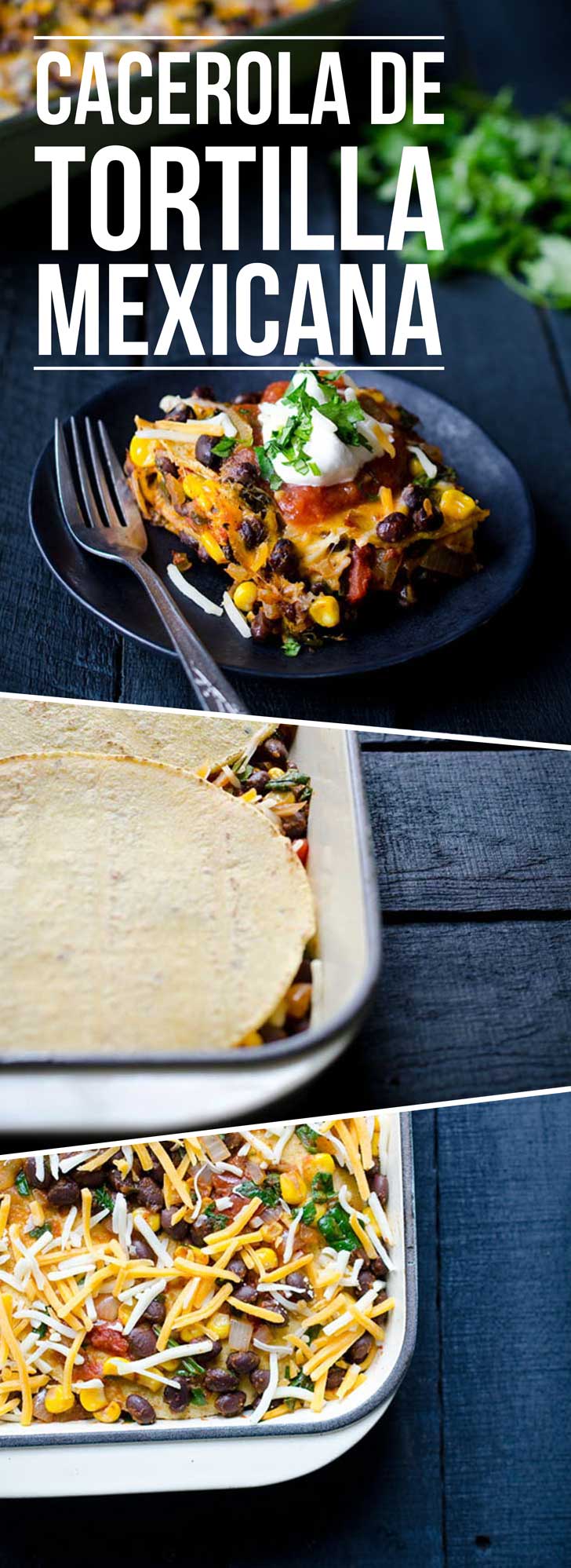 Pon dos tortillas de maíz al fondo de la cacerola preparada y cubre con ¼ de la mezcla de frijoles, esparciendo de forma pareja. Rocía con ½ taza de queso. Repite hasta que hayas usado todos los ingredientes, terminando con el queso.